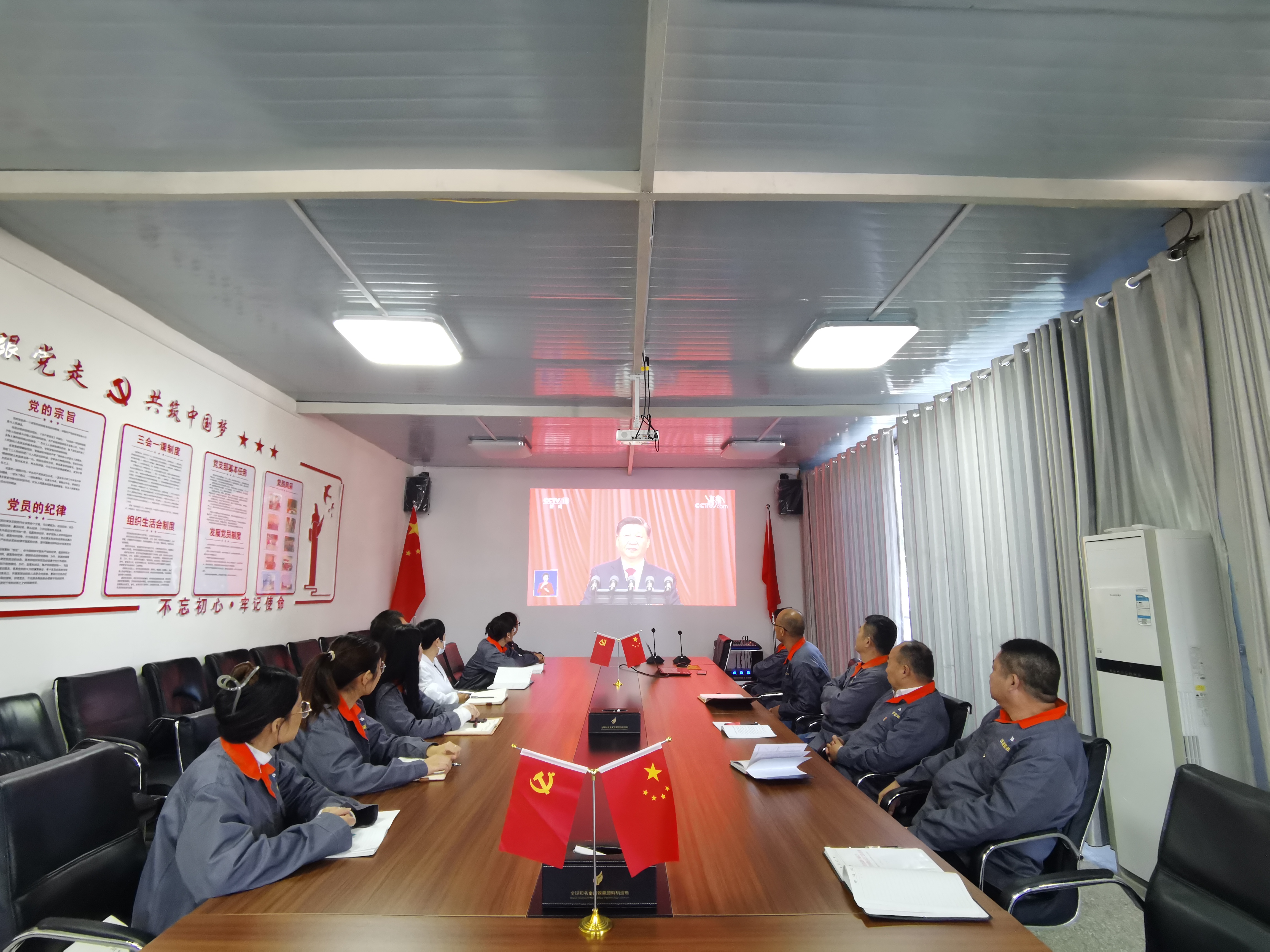 在黨支部書記李自林的帶領下,大家都身著工裝,帶上黨徽懷著激動的心情正襟危坐,認真觀看,聽著習總書記堅定充滿力量的